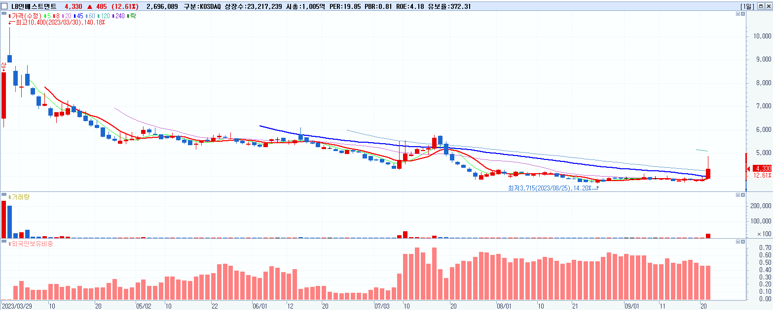 - LB인베스트먼트 (4,330원 ▲ 12.61% , 시총: 1,005억, 거래량: 2,696,089, 거래대금:120억)