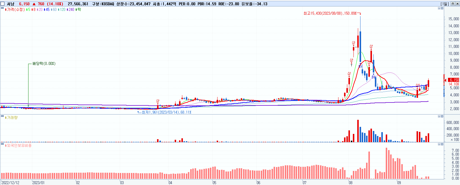 - 서남 (6,150원 ▲ 14.1% , 시총: 1,442억, 거래량: 27,566,361, 거래대금:1,624억)