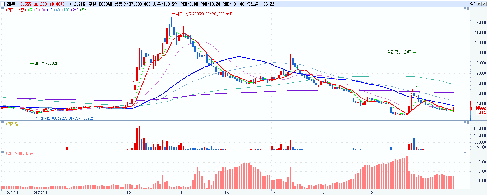- 레몬 (3,555원 ▲ 8.88% , 시총: 1,315억, 거래량: 412,716, 거래대금:14억)