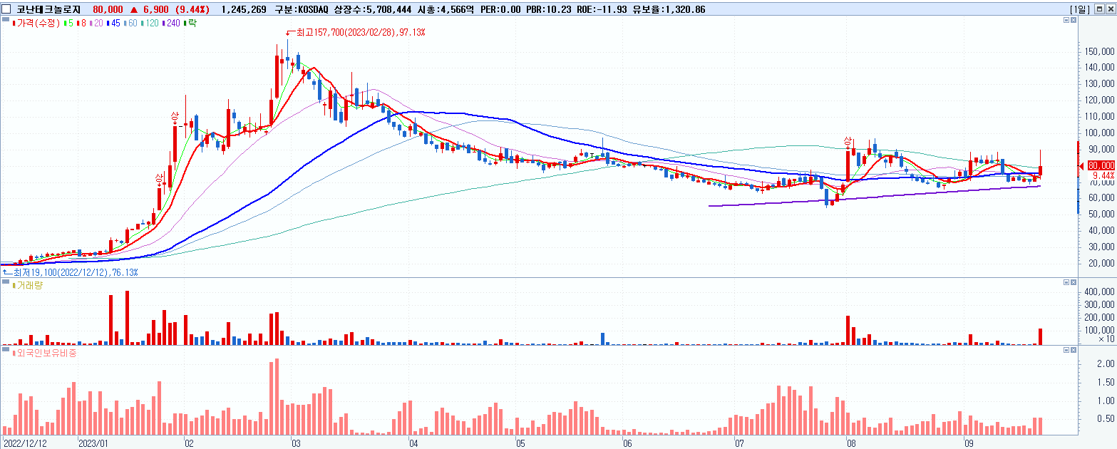 - 코난테크놀로지 (80,000원 ▲ 9.44% , 시총: 4,567억, 거래량: 1,245,269, 거래대금:1,046억)