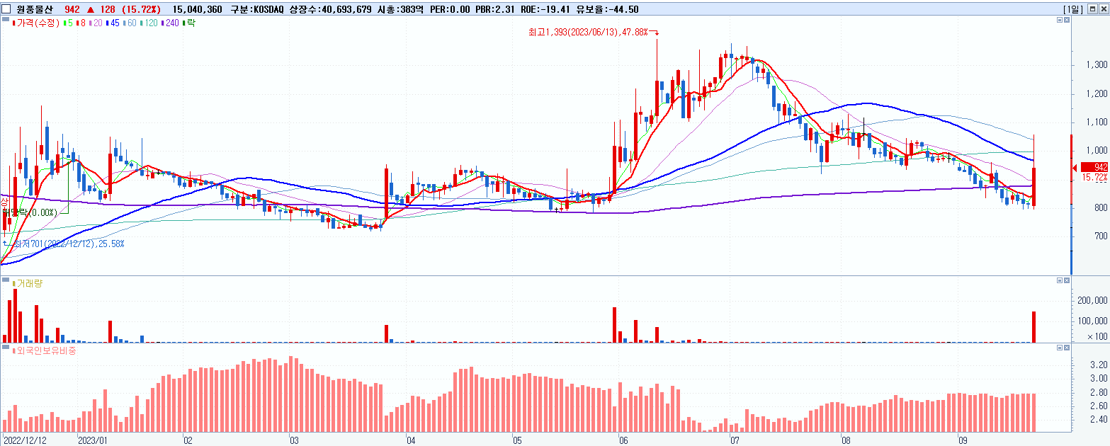 - 원풍물산 (942원 ▲ 15.72% , 시총: 383억, 거래량: 15,040,360, 거래대금:152억)