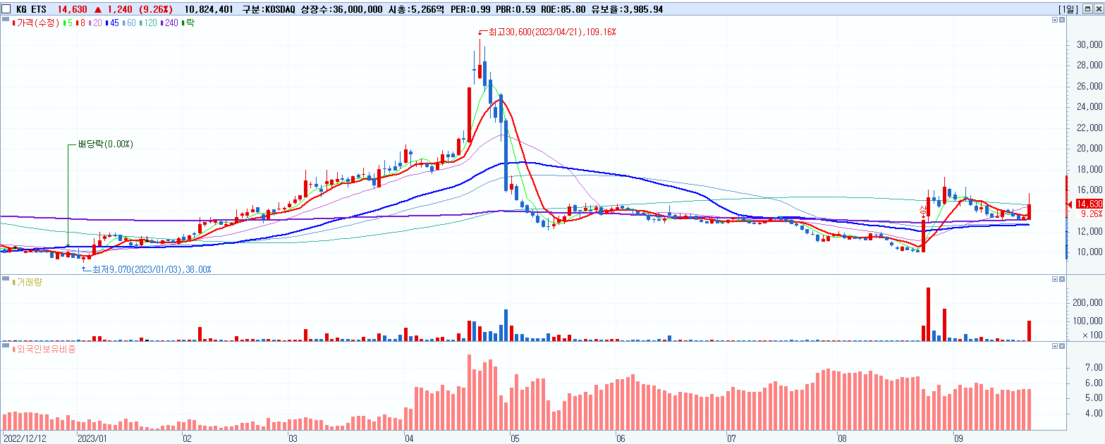 - KG ETS (14,630원 ▲ 9.26% , 시총: 5,267억, 거래량: 10,824,401, 거래대금:1,609억)