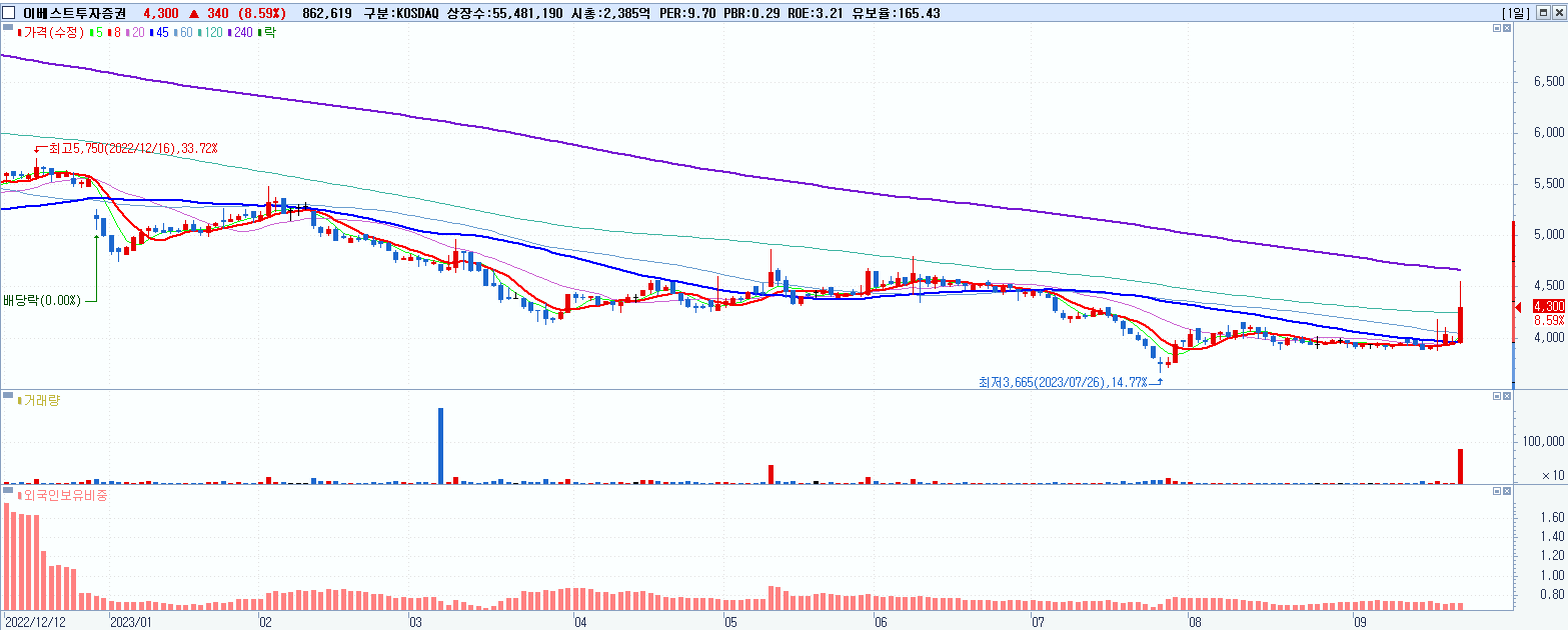 - 이베스트투자증권 (4,300원 ▲ 8.59% , 시총: 2,386억, 거래량: 862,619, 거래대금:38억)
