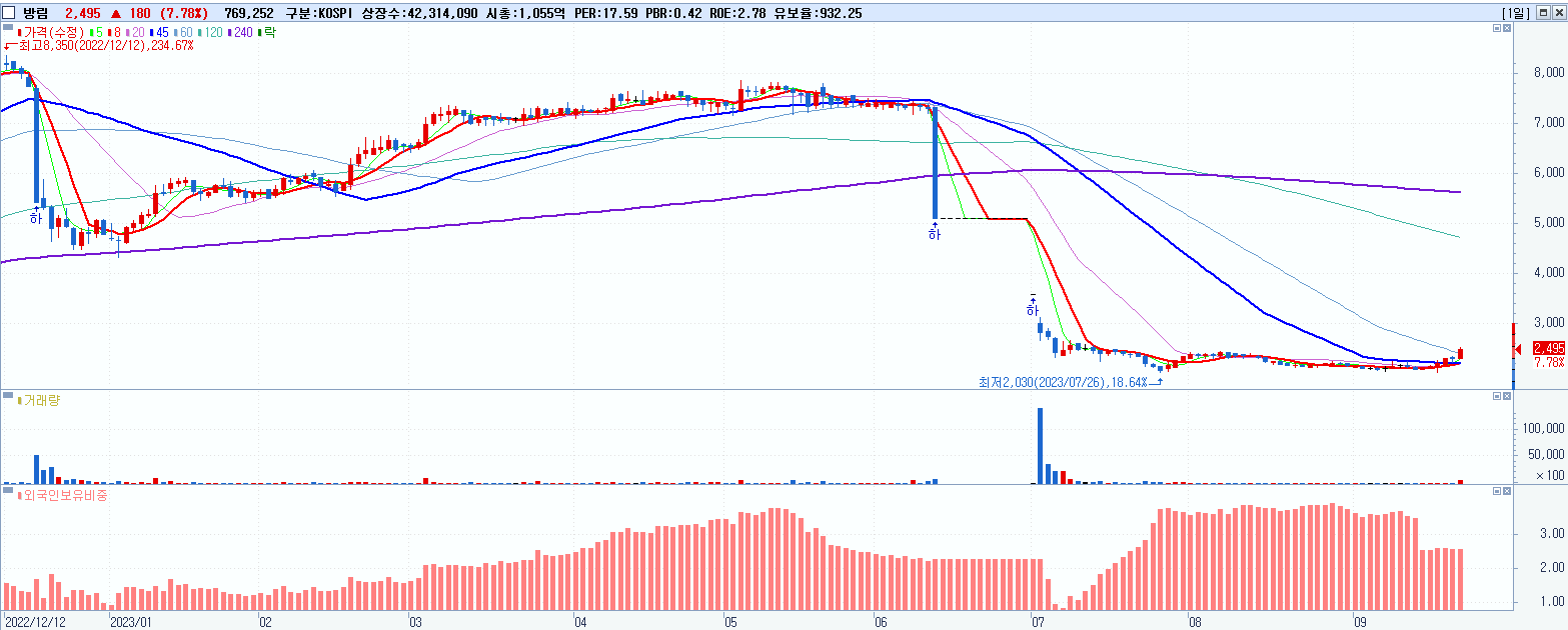 - 방림 (2,495원 ▲ 7.78% , 시총: 1,056억, 거래량: 769,252, 거래대금:19억)