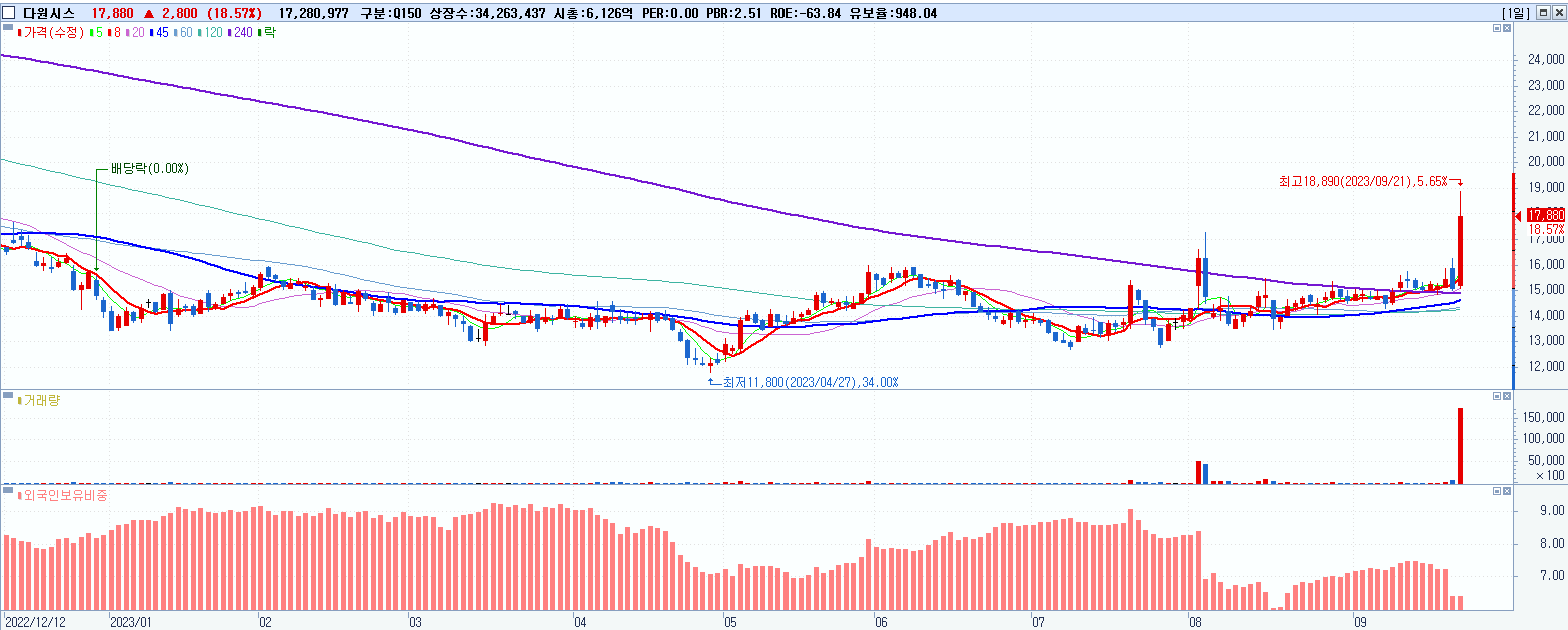 - 다원시스 (17,880원 ▲ 18.57% , 시총: 6,126억, 거래량: 17,280,977, 거래대금:3,054억)