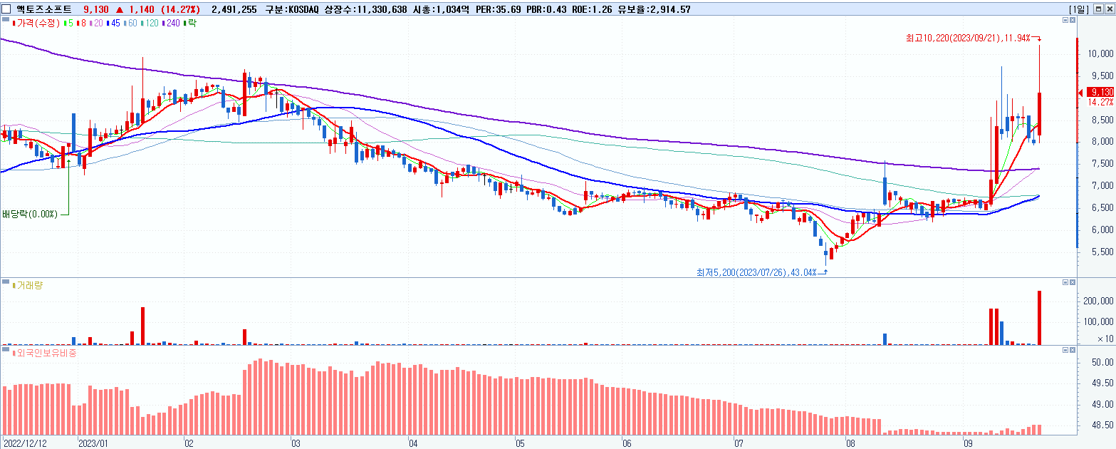 - 액토즈소프트 (9,130원 ▲ 14.27% , 시총: 1,034억, 거래량: 2,491,255, 거래대금:240억)