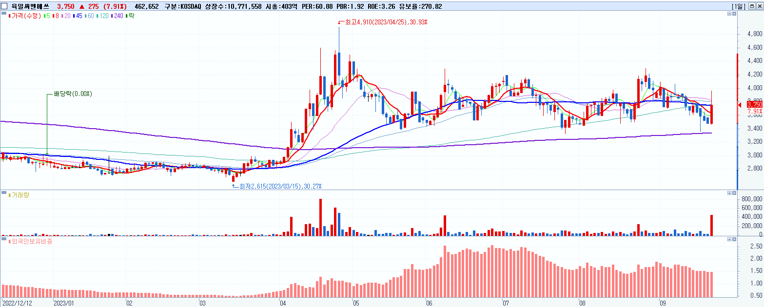 - 육일씨엔에쓰 (3,750원 ▲ 7.91% , 시총: 404억, 거래량: 462,652, 거래대금:17억)