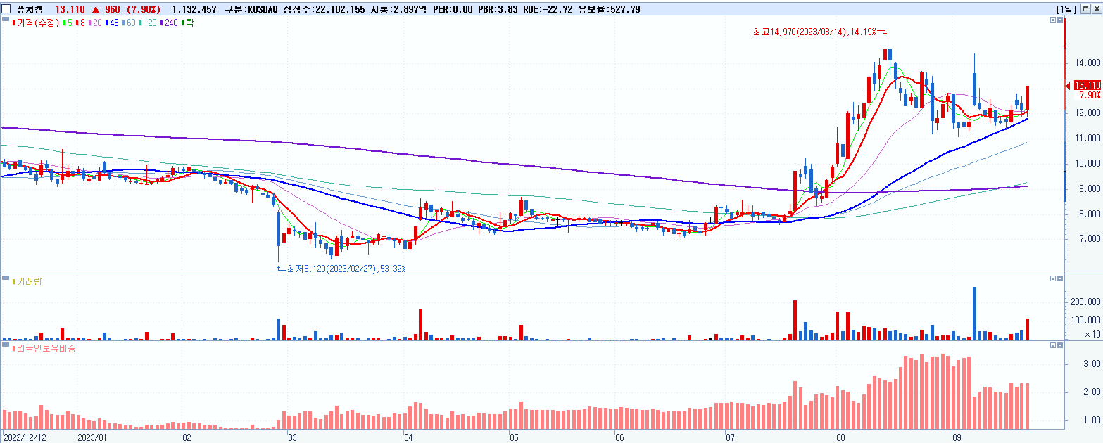 - 퓨쳐켐 (13,110원 ▲ 7.9% , 시총: 2,898억, 거래량: 1,132,457, 거래대금:145억)