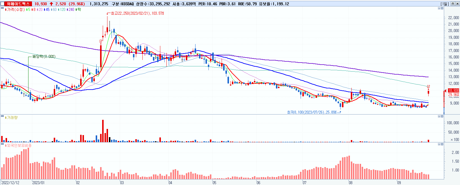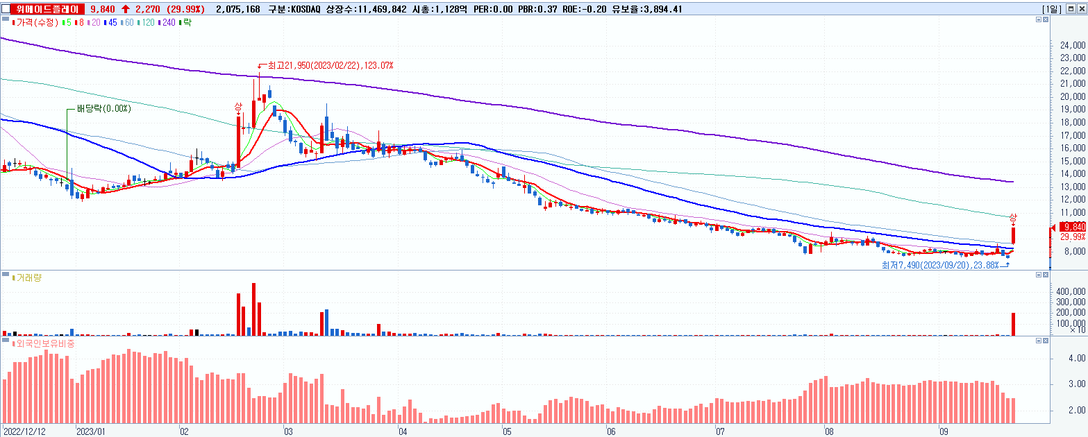 - 위메이드플레이 (9,840원 ▲ 29.99% , 시총: 1,129억, 거래량: 2,075,168, 거래대금:201억)