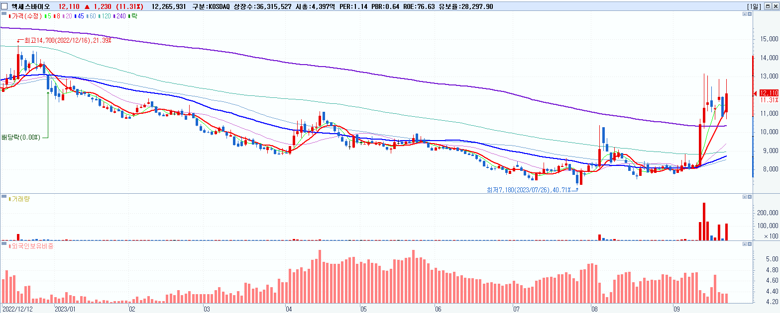- 엑세스바이오 (12,110원 ▲ 11.31% , 시총: 4,398억, 거래량: 12,265,931, 거래대금:1,495억)