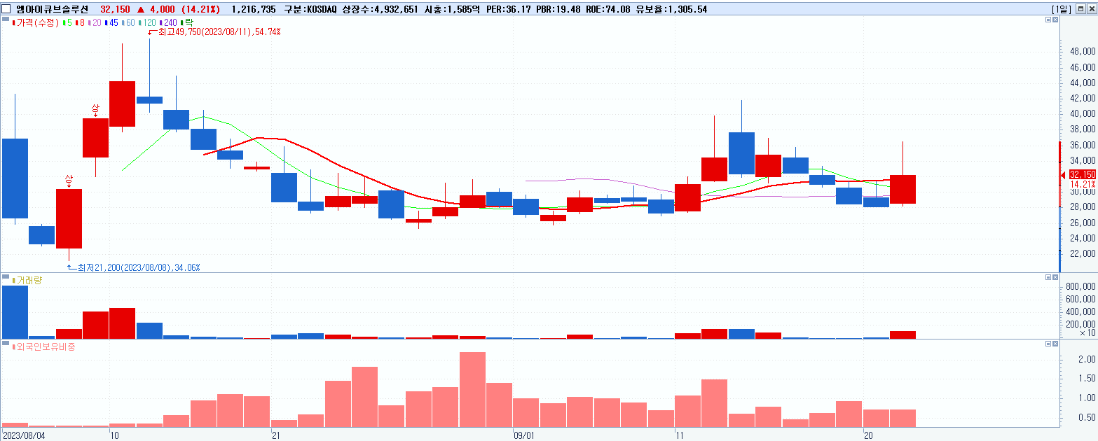 - 엠아이큐브솔루션 (32,150원 ▲ 14.21% , 시총: 1,586억, 거래량: 1,216,735, 거래대금:410억)