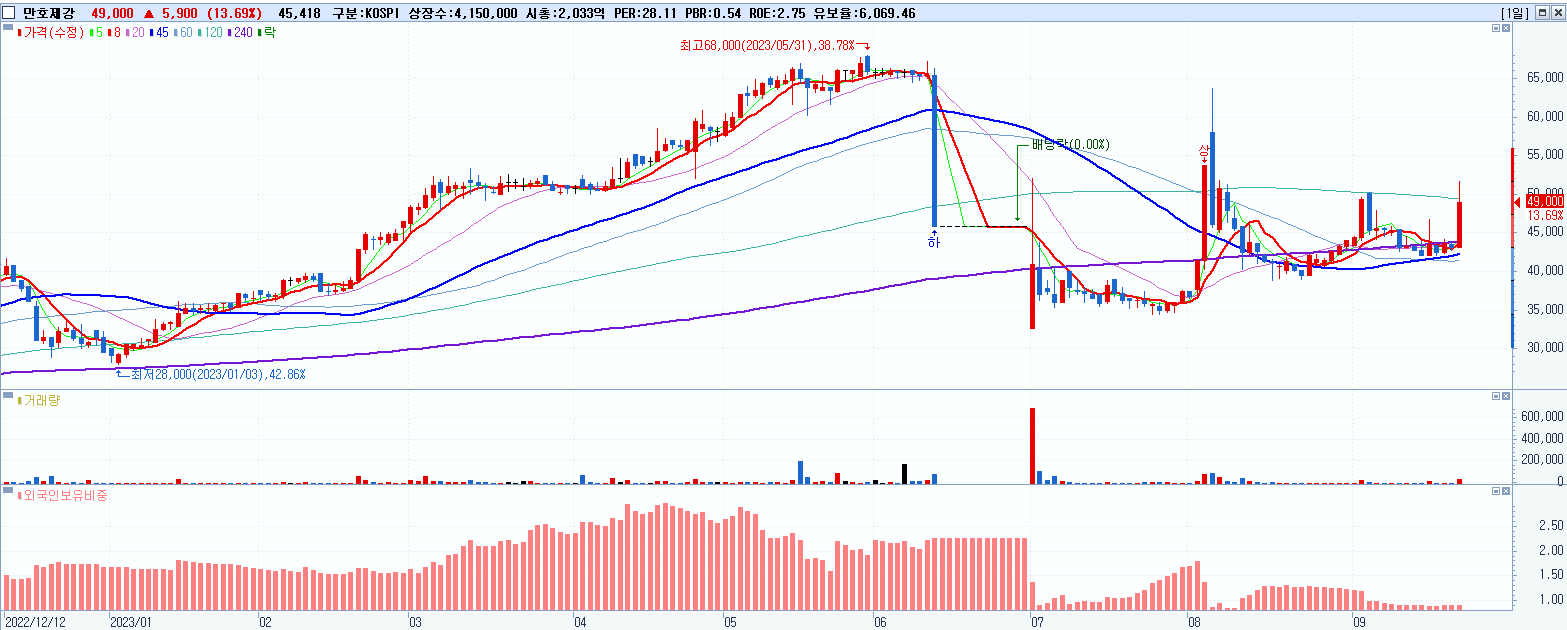 - 만호제강 (49,000원 ▲ 13.69% , 시총: 2,034억, 거래량: 45,418, 거래대금:22억)
