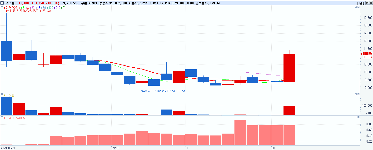 - 넥스틸 (11,180원 ▲ 18.81% , 시총: 2,907억, 거래량: 9,718,536, 거래대금:1,042억)