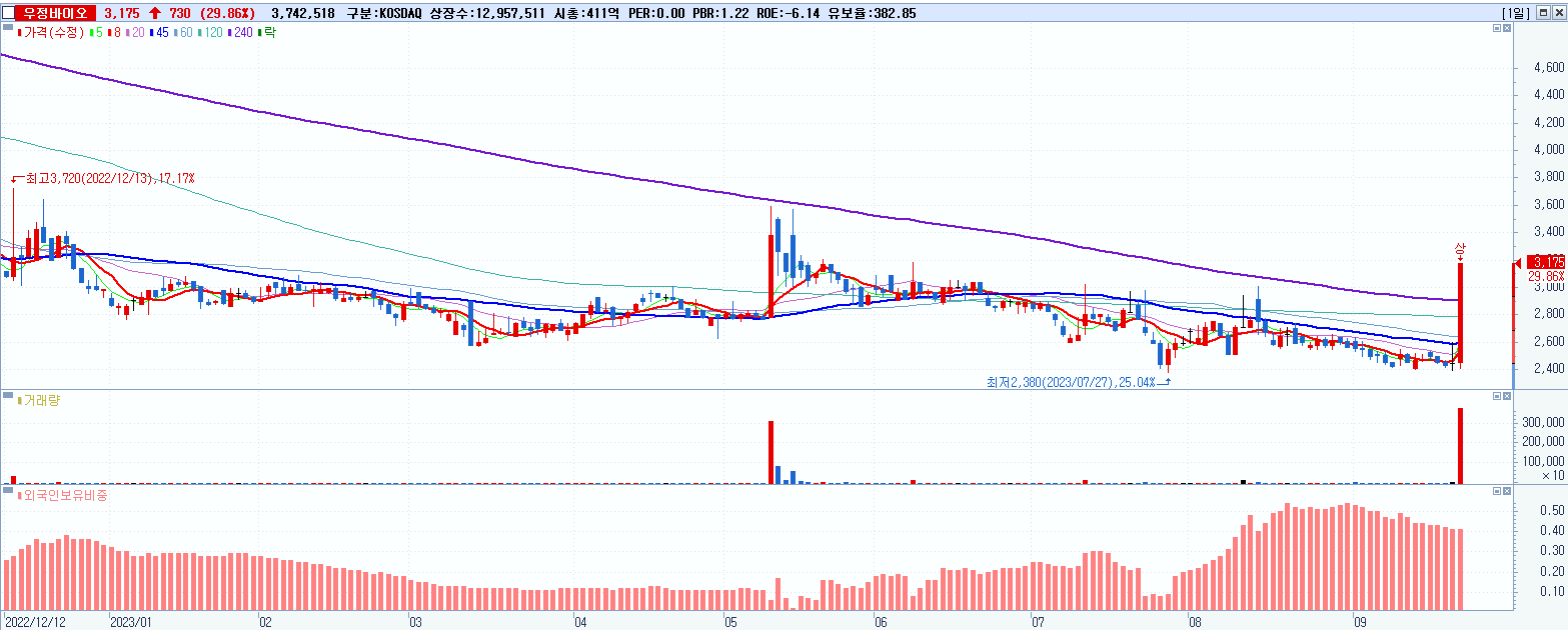 - 우정바이오 (3,175원 ▲ 29.86% , 시총: 411억, 거래량: 3,742,518, 거래대금:112억)