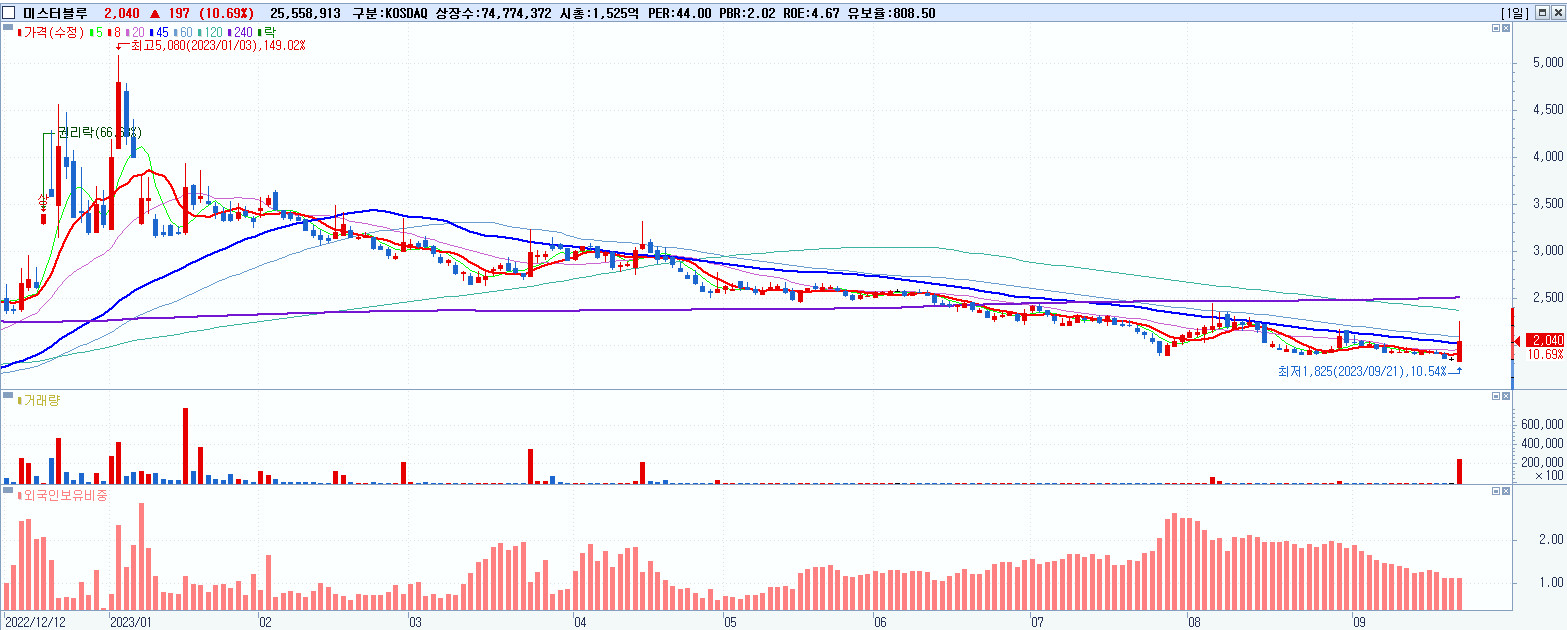 - 미스터블루 (2,040원 ▲ 10.69% , 시총: 1,525억, 거래량: 25,558,913, 거래대금:547억)