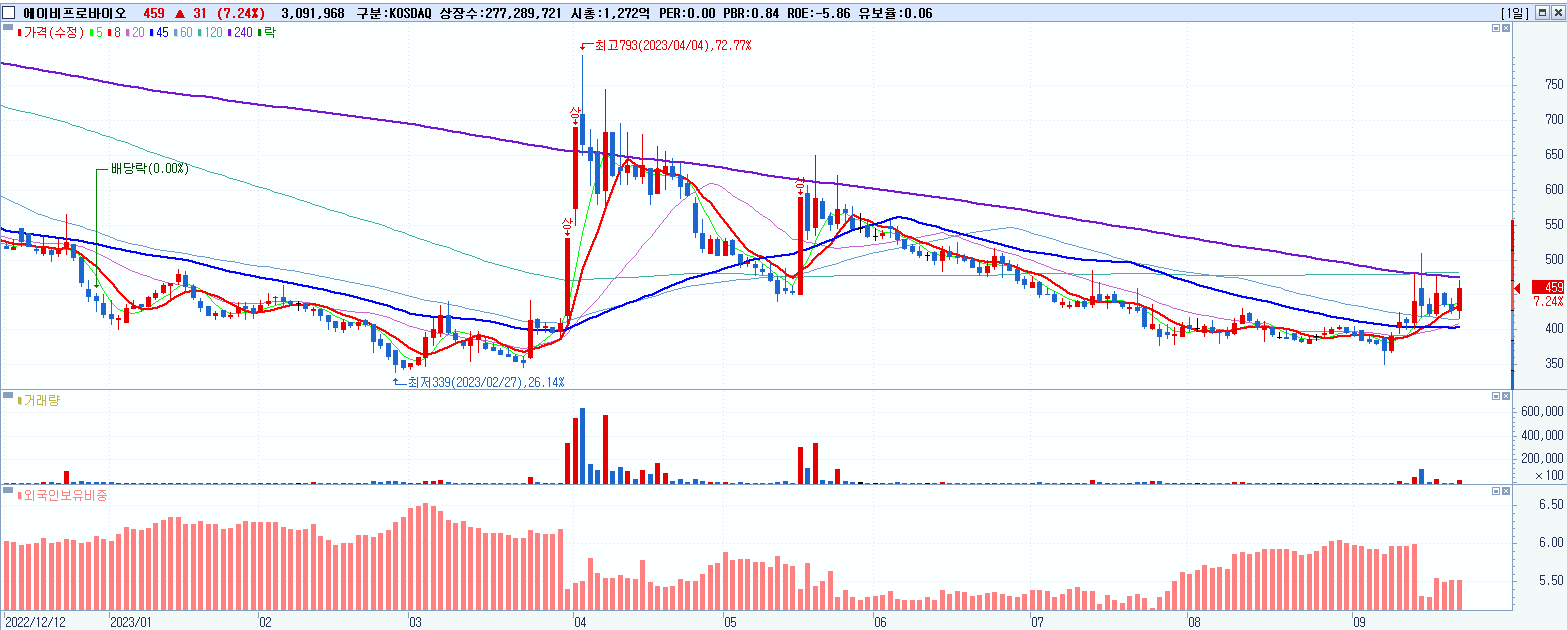 - 에이비프로바이오 (459원 ▲ 7.24% , 시총: 1,273억, 거래량: 3,091,968, 거래대금:14억)
