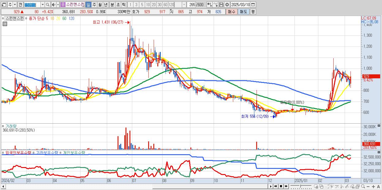 - 스킨앤스킨 (929원 ▲ 9.42% , 시총: 338억, 거래량: 360,691, 거래대금:3억)