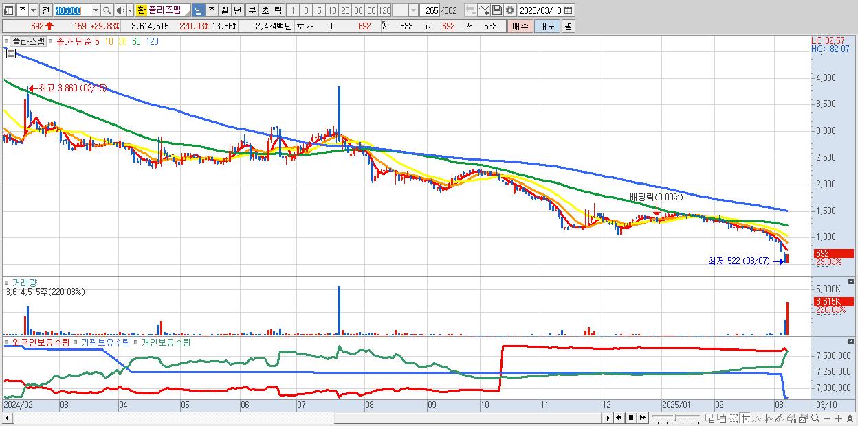 - 플라즈맵 (692원 ▲ 29.83% , 시총: 180억, 거래량: 3,614,515, 거래대금:24억)