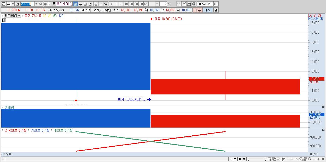 - 엠디바이스 (12,200원 ▲ 9.91% , 시총: 1,289억, 거래량: 24,705,324, 거래대금:2,892억)