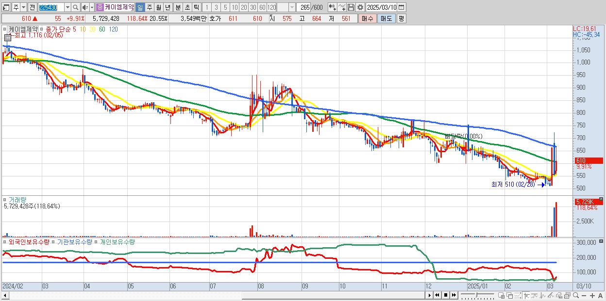 - 케이엠제약 (610원 ▲ 9.91% , 시총: 170억, 거래량: 5,729,428, 거래대금:35억)