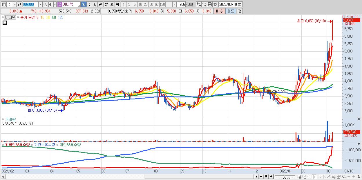 - 이니텍 (6,040원 ▲ 13.96% , 시총: 1,195억, 거래량: 578,540, 거래대금:33억)