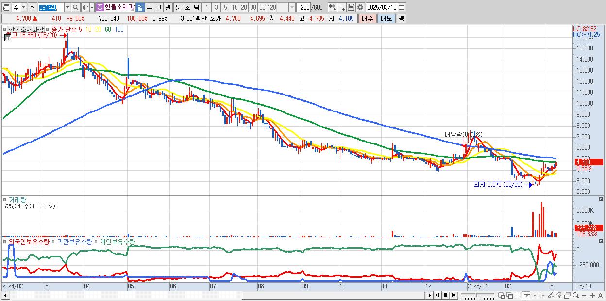 - 한울소재과학 (4,700원 ▲ 9.56% , 시총: 1,140억, 거래량: 725,248, 거래대금:33억)