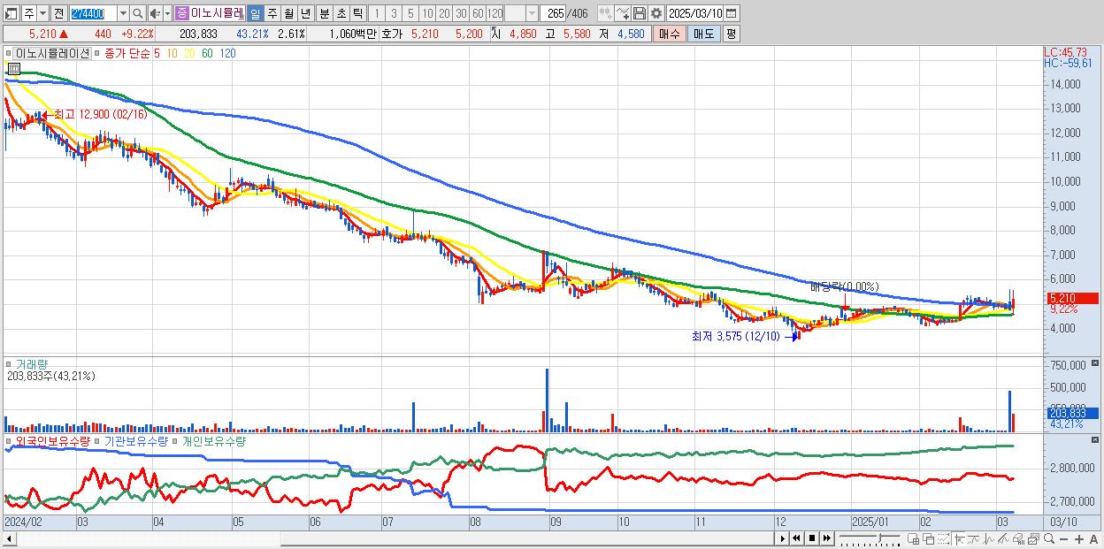 - 이노시뮬레이션 (5,210원 ▲ 9.22% , 시총: 407억, 거래량: 203,833, 거래대금:11억)