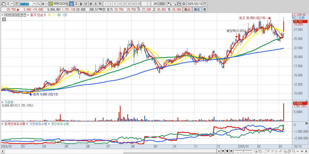 - HD현대마린엔진 (29,750원 ▲ 15.09% , 시총: 10,092억, 거래량: 9,804,881, 거래대금:2,885억)
