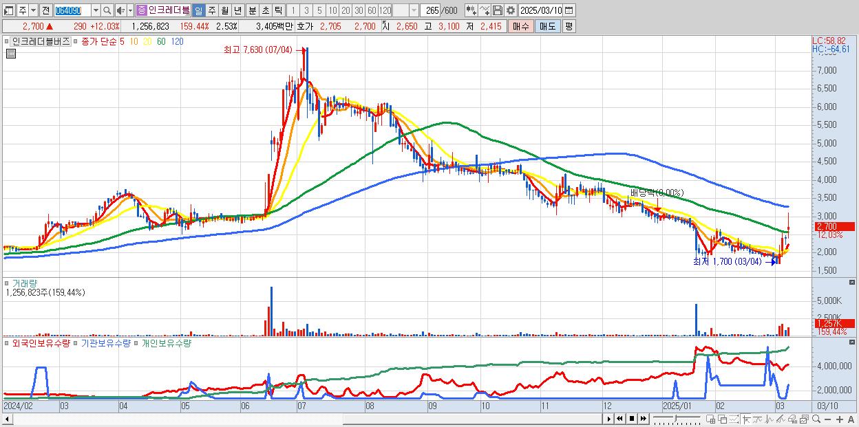 - 인크레더블버즈 (2,700원 ▲ 12.03% , 시총: 1,343억, 거래량: 1,256,823, 거래대금:34억)