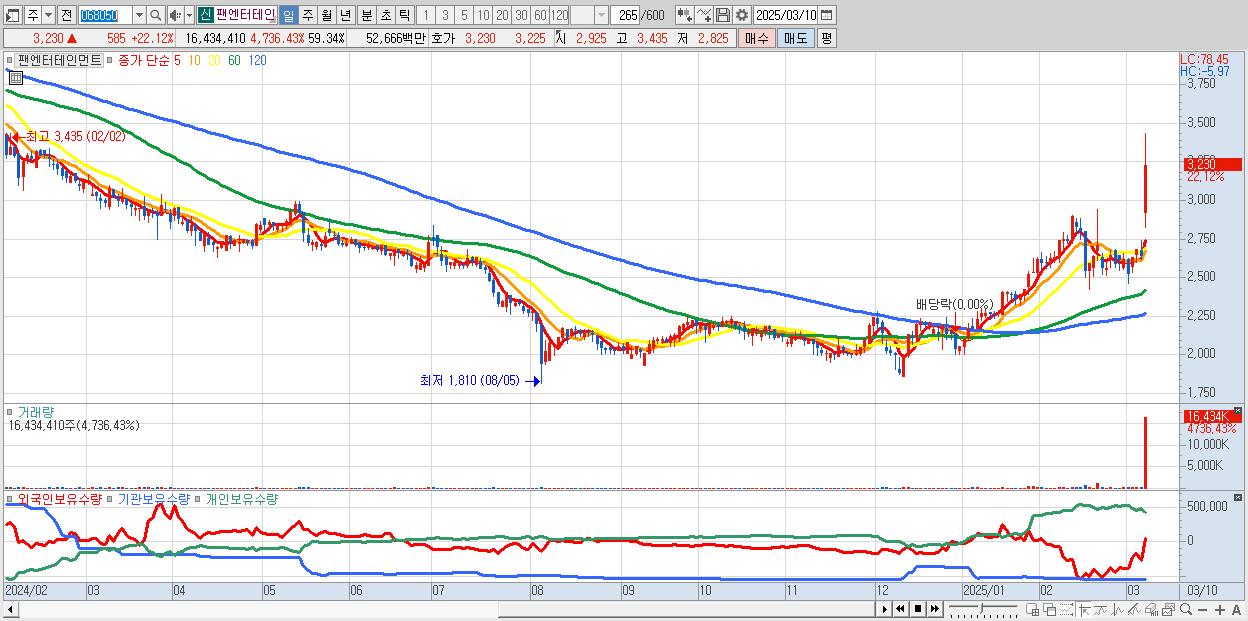 - 팬엔터테인먼트 (3,230원 ▲ 22.12% , 시총: 895억, 거래량: 16,434,410, 거래대금:527억)