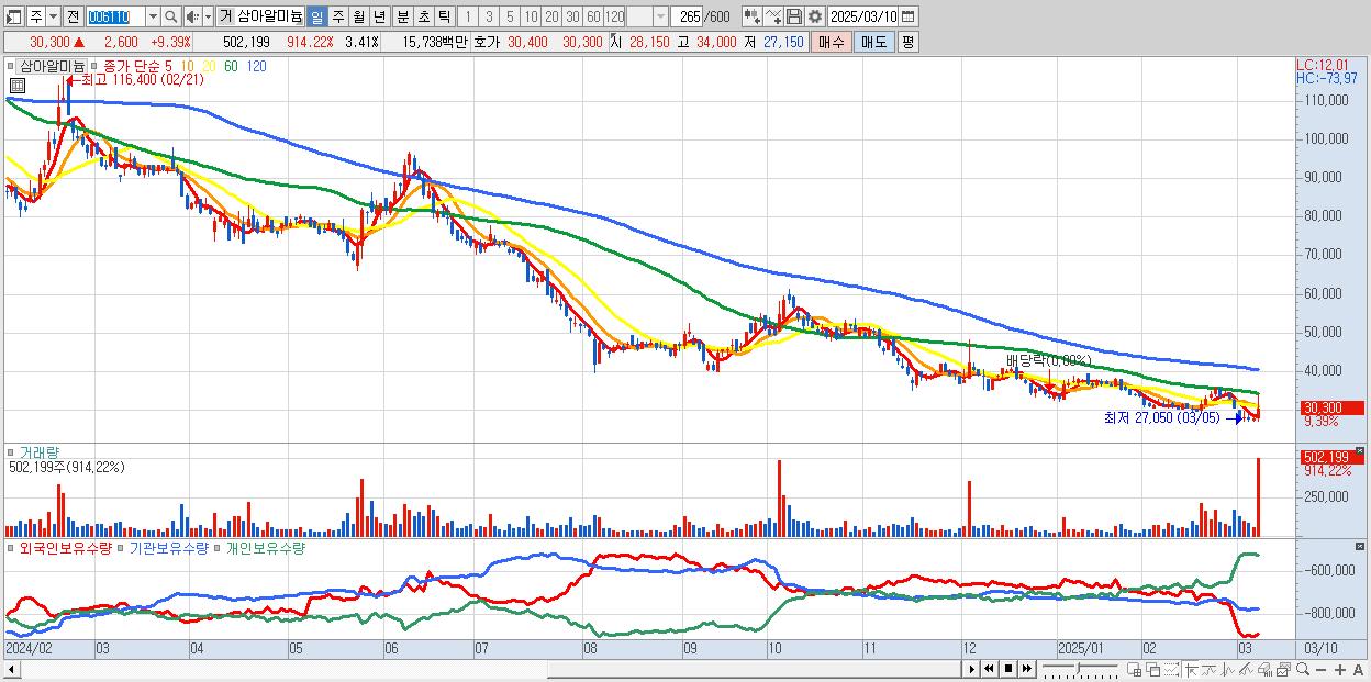 - 삼아알미늄 (30,300원 ▲ 9.39% , 시총: 4,458억, 거래량: 502,199, 거래대금:157억)