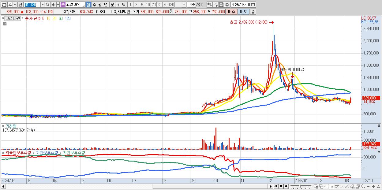 - 고려아연 (829,000원 ▲ 14.19% , 시총: 171,630억, 거래량: 137,345, 거래대금:1,135억)