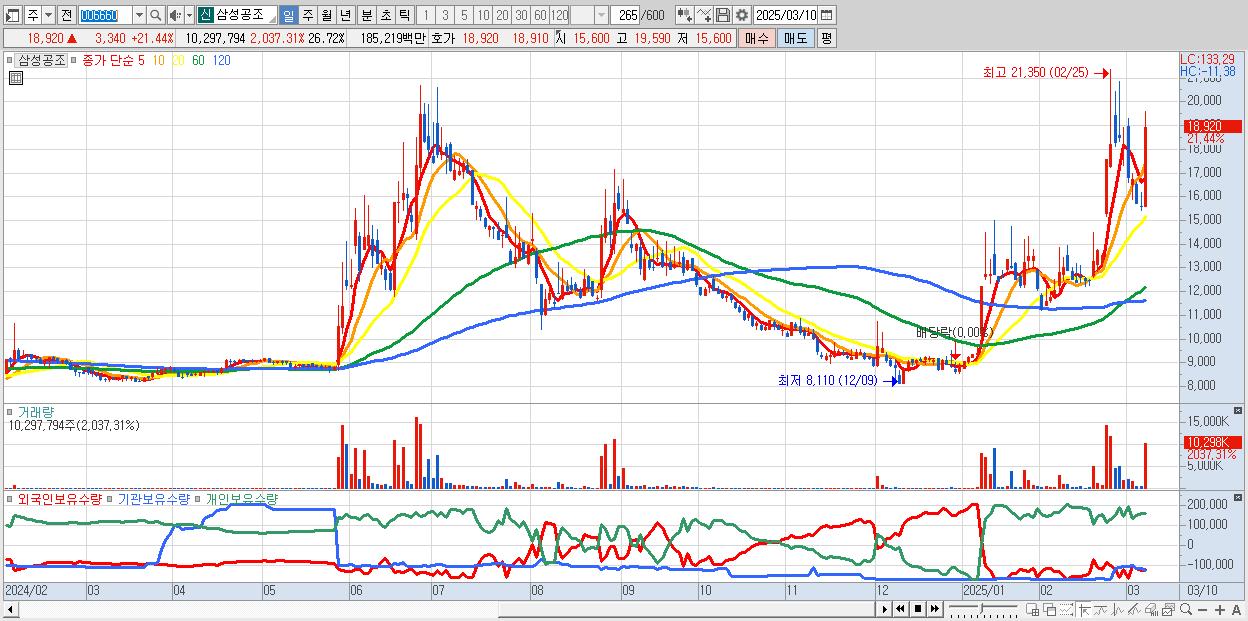 - 삼성공조 (18,920원 ▲ 21.44% , 시총: 1,537억, 거래량: 10,297,794, 거래대금:1,852억)