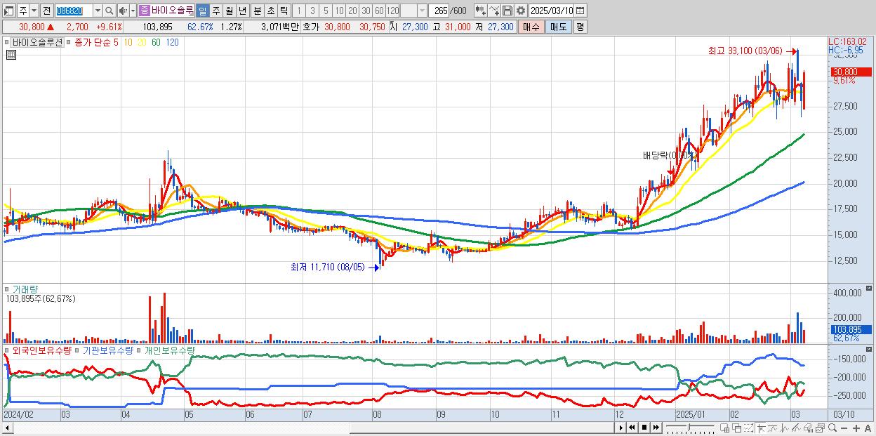 - 바이오솔루션 (30,800원 ▲ 9.61% , 시총: 2,514억, 거래량: 103,895, 거래대금:31억)