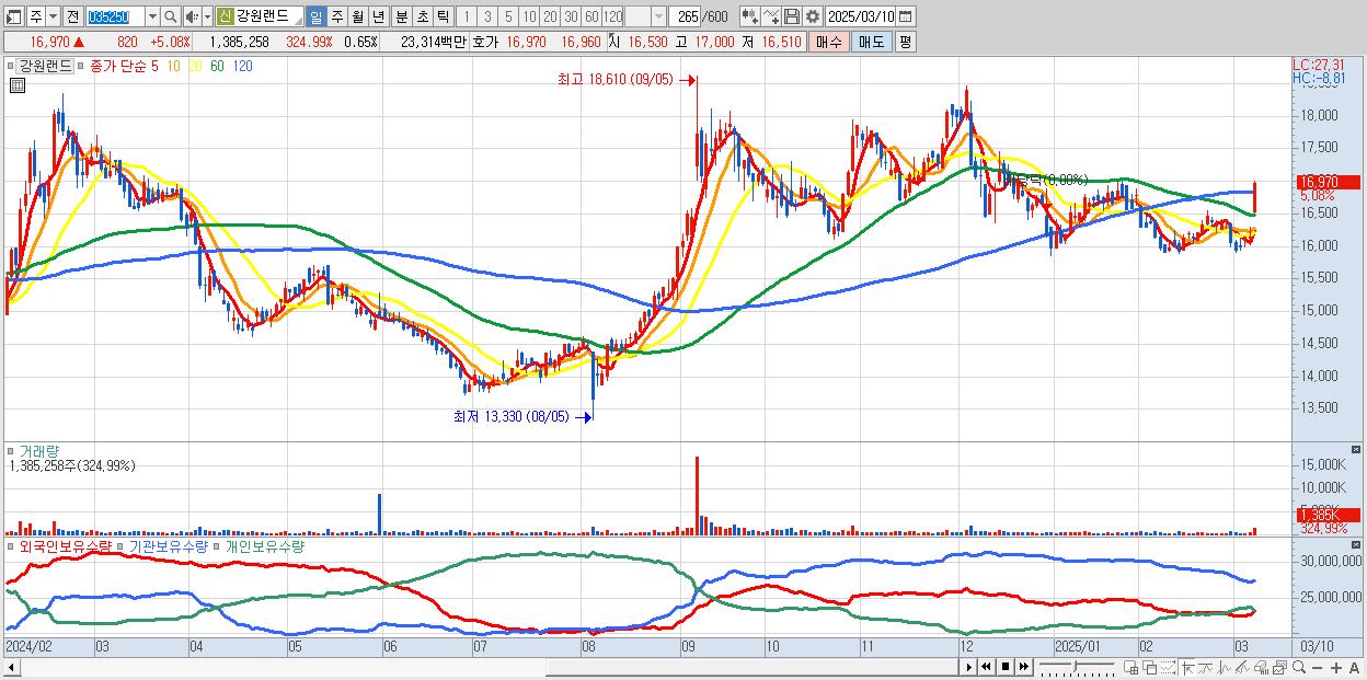 - 강원랜드 (16,970원 ▲ 5.08% , 시총: 36,306억, 외국인 순매수 거래금:57억)
