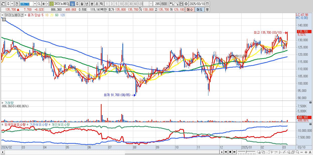 - SK이노베이션 (135,700원 ▲ 6.02% , 시총: 204,954억, 외국인 순매수 거래금:198억)