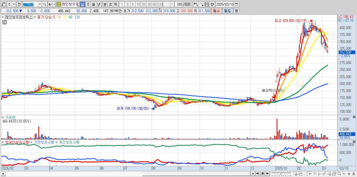 - 레인보우로보틱스 (312,500원 ▼ -2.65% , 시총: 60,625억, 외국인 순매수 거래금:72억)