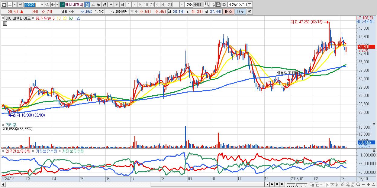 - 에이비엘바이오 (39,500원 ▲ 2.2% , 시총: 19,071억, 외국인 순매수 거래금:42억)