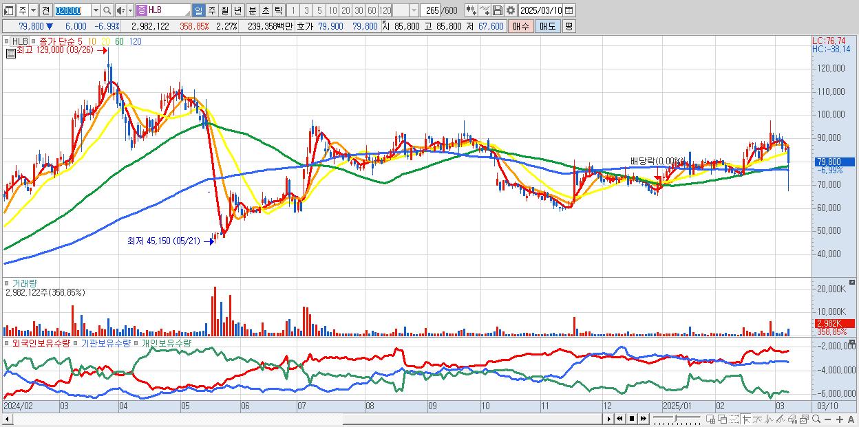- HLB (79,800원 ▼ -6.99% , 시총: 104,847억, 외국인 순매수 거래금:85억)
