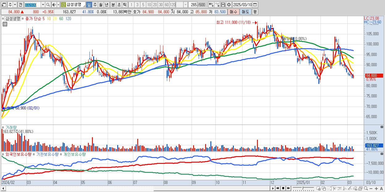 - 삼성생명 (84,800원 ▲ 0.95% , 시총: 169,600억, 외국인 순매수 거래금:33억)