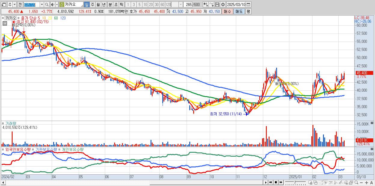 - 카카오 (45,400원 ▲ 3.77% , 시총: 201,429억, 외국인 순매수 거래금:313억)