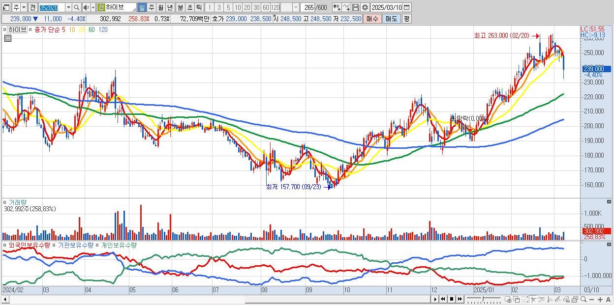 - 하이브 (239,000원 ▼ -4.4% , 시총: 99,549억, 외국인 순매수 거래금:77억)