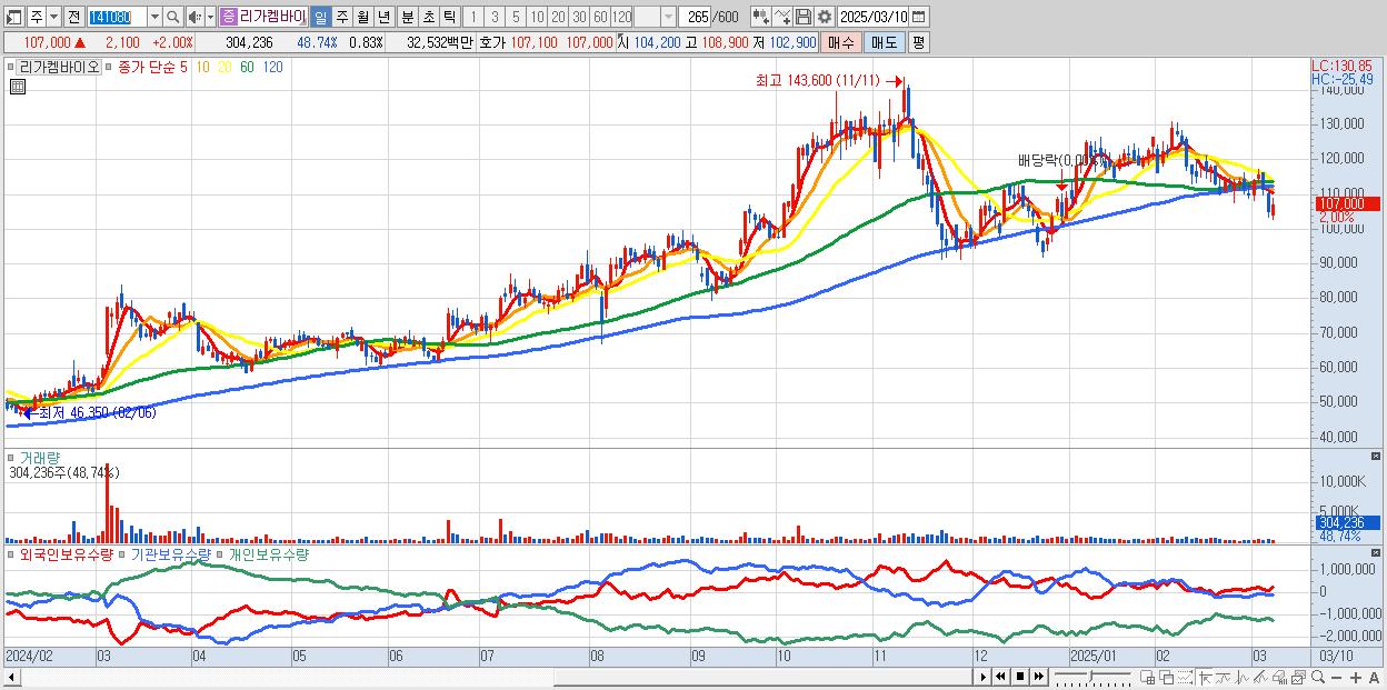 - 리가켐바이오 (107,000원 ▲ 2% , 시총: 39,173억, 외국인 순매수 거래금:81억)