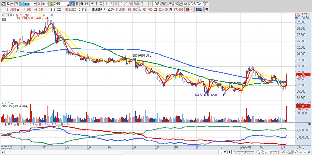 - S-Oil (62,200원 ▲ 8.74% , 시총: 70,026억, 외국인 순매수 거래금:109억)