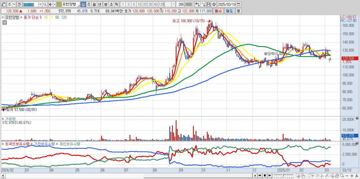 - 유한양행 (120,500원 ▲ 1.35% , 시총: 96,652억, 외국인 순매수 거래금:51억)
