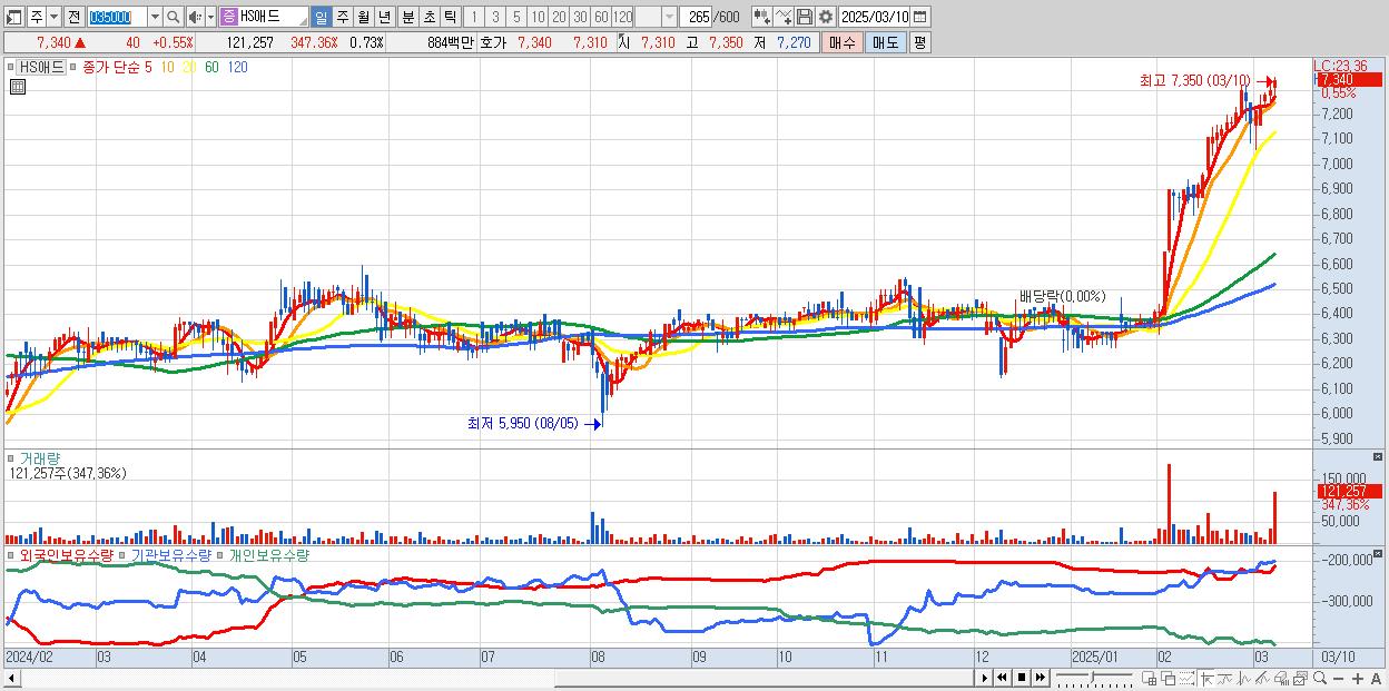 - HS애드 (7,340원 ▲ 0.55% , 시총: 1,216억, 거래량: 121,257, 거래대금:9억, KOSPI)