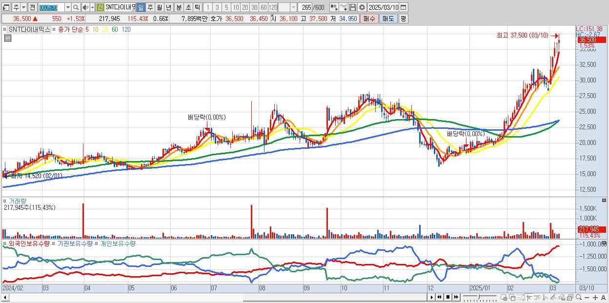 - SNT다이내믹스 (36,500원 ▲ 1.53% , 시총: 12,137억, 거래량: 217,945, 거래대금:79억, KOSPI)