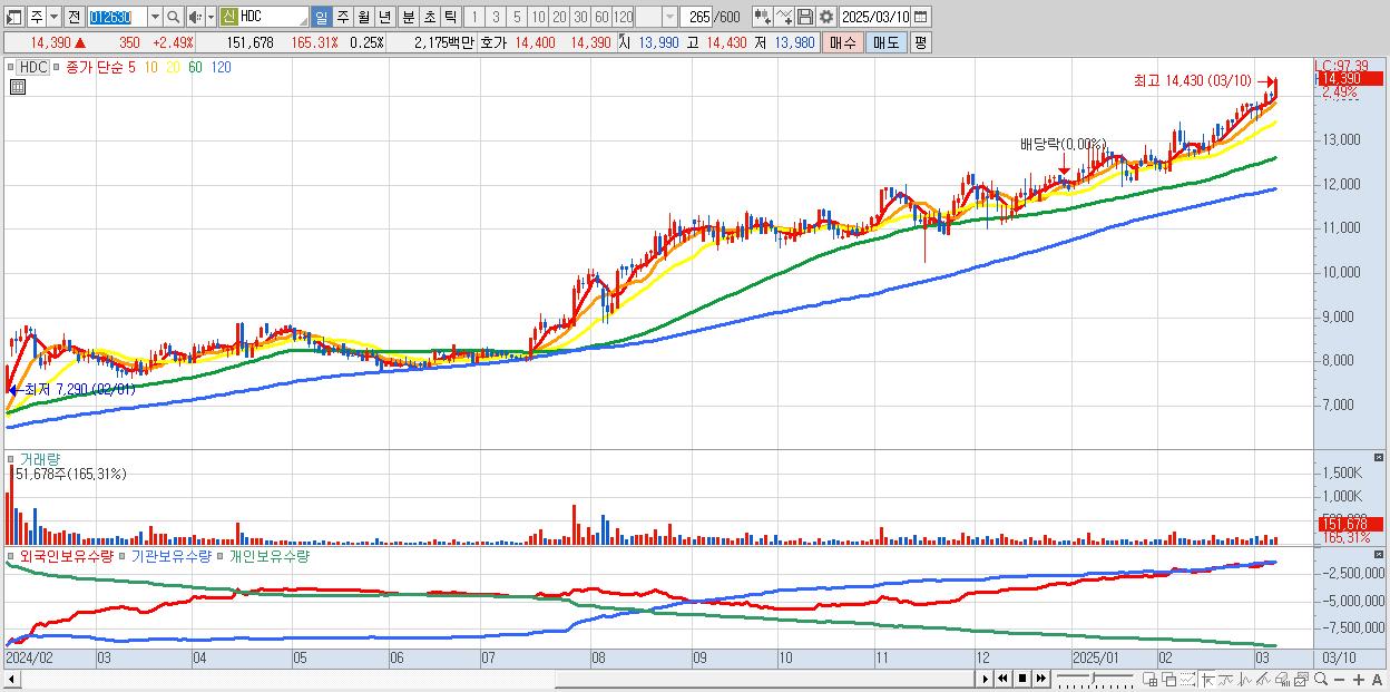 - HDC (14,390원 ▲ 2.49% , 시총: 8,597억, 거래량: 151,678, 거래대금:22억, KOSPI)