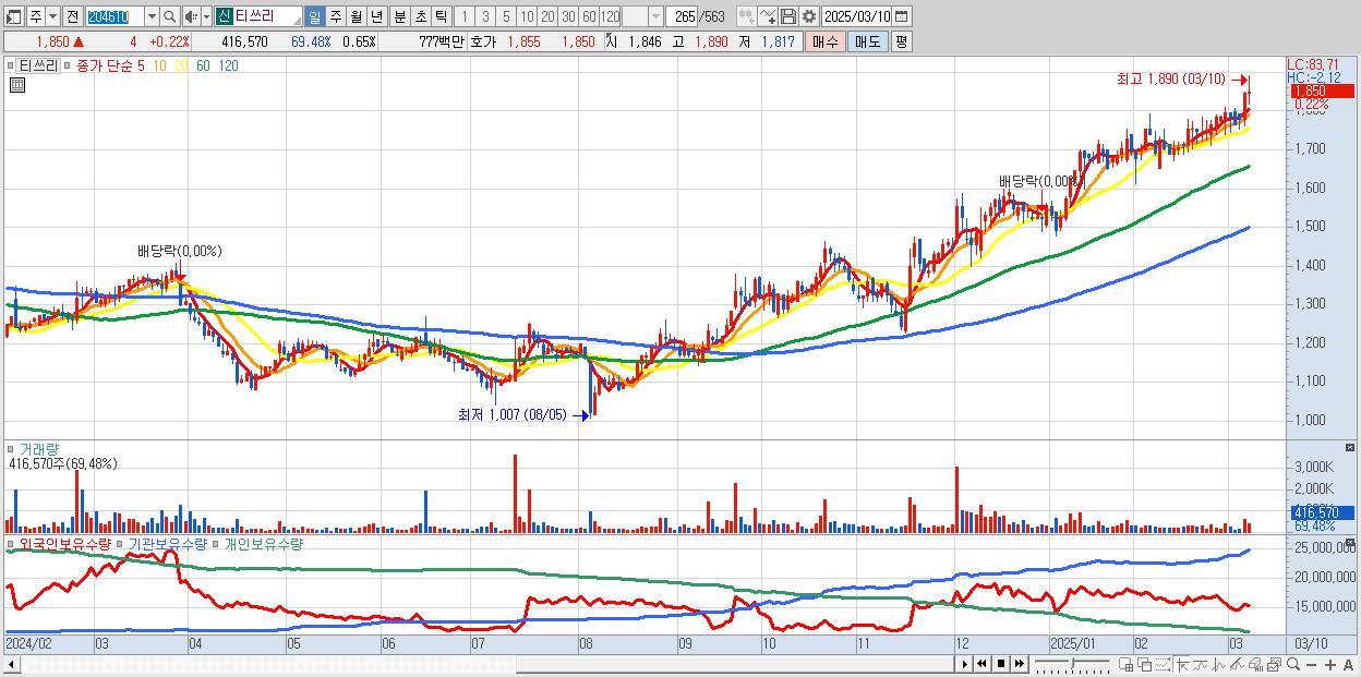 - 티쓰리 (1,850원 ▲ 0.22% , 시총: 1,188억, 거래량: 416,570, 거래대금:8억, KOSDAQ)
