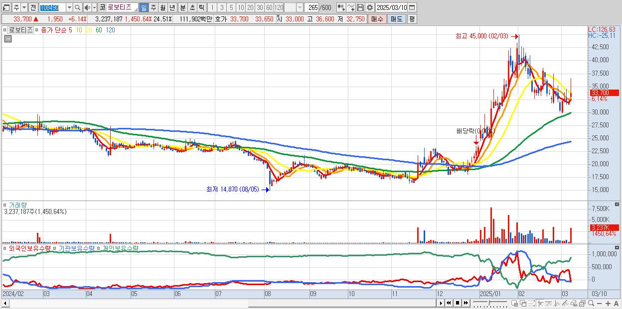 - 로보티즈 (33,700원 ▲ 6.14% , 시총: 4,451억, 거래량: 3,237,187, 거래대금:1,119억)